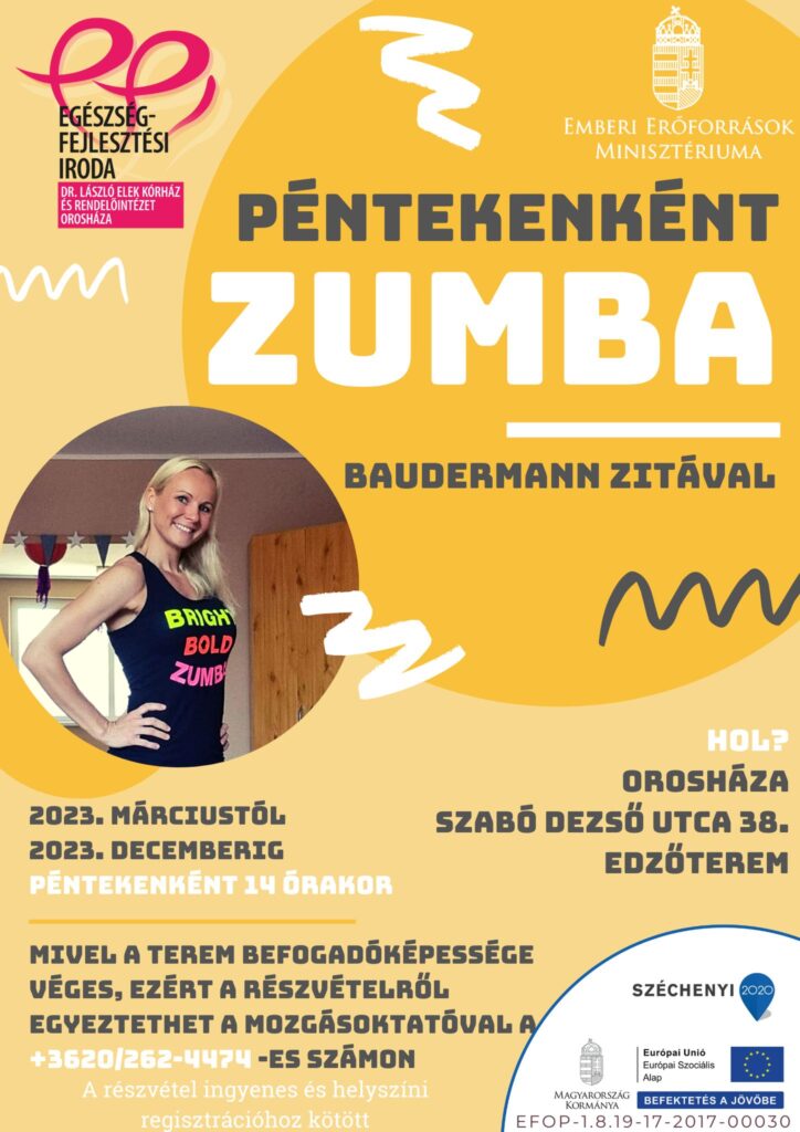 A zumba órát Baudermann Zita tartja, Orosházán a Szabó Dezső utca 38. szám alatt péntekenként 14 órától.